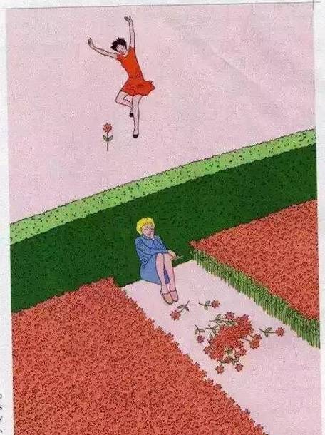两个心情各异的姑娘,一个对着一朵花,心花怒放,欢欣鼓舞。一个守着一片花海和一把刚采下来的花却愁容不展。