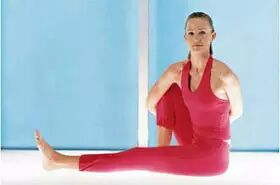 1.坐在地板上,两条腿伸直。弯曲右腿,尽量向臀部收紧,使右脚脚踝靠近左腿根,身体稍侧。