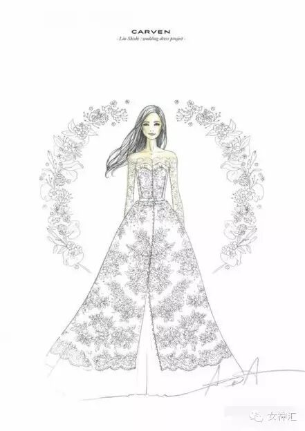婚纱由Carven品牌的20位巴黎工匠师3个月耗费逾 500 小时完成的,上面绣有诗诗的名字,整条婚纱裙上的蕾丝刺绣花型也是根据诗诗的意愿完成的!