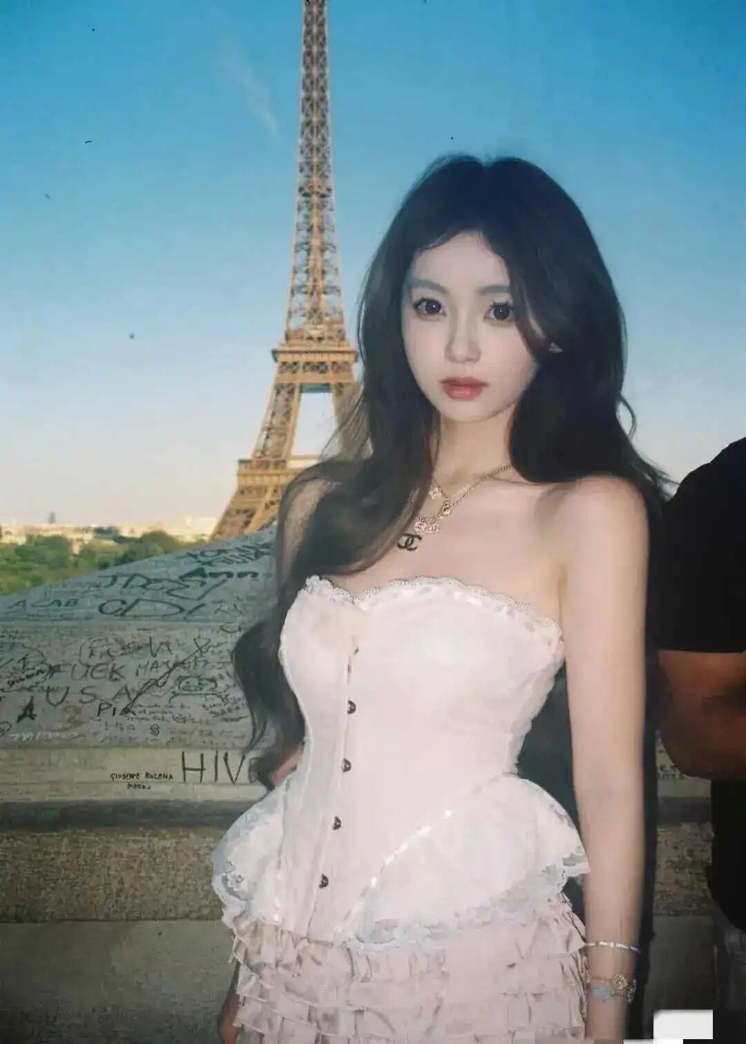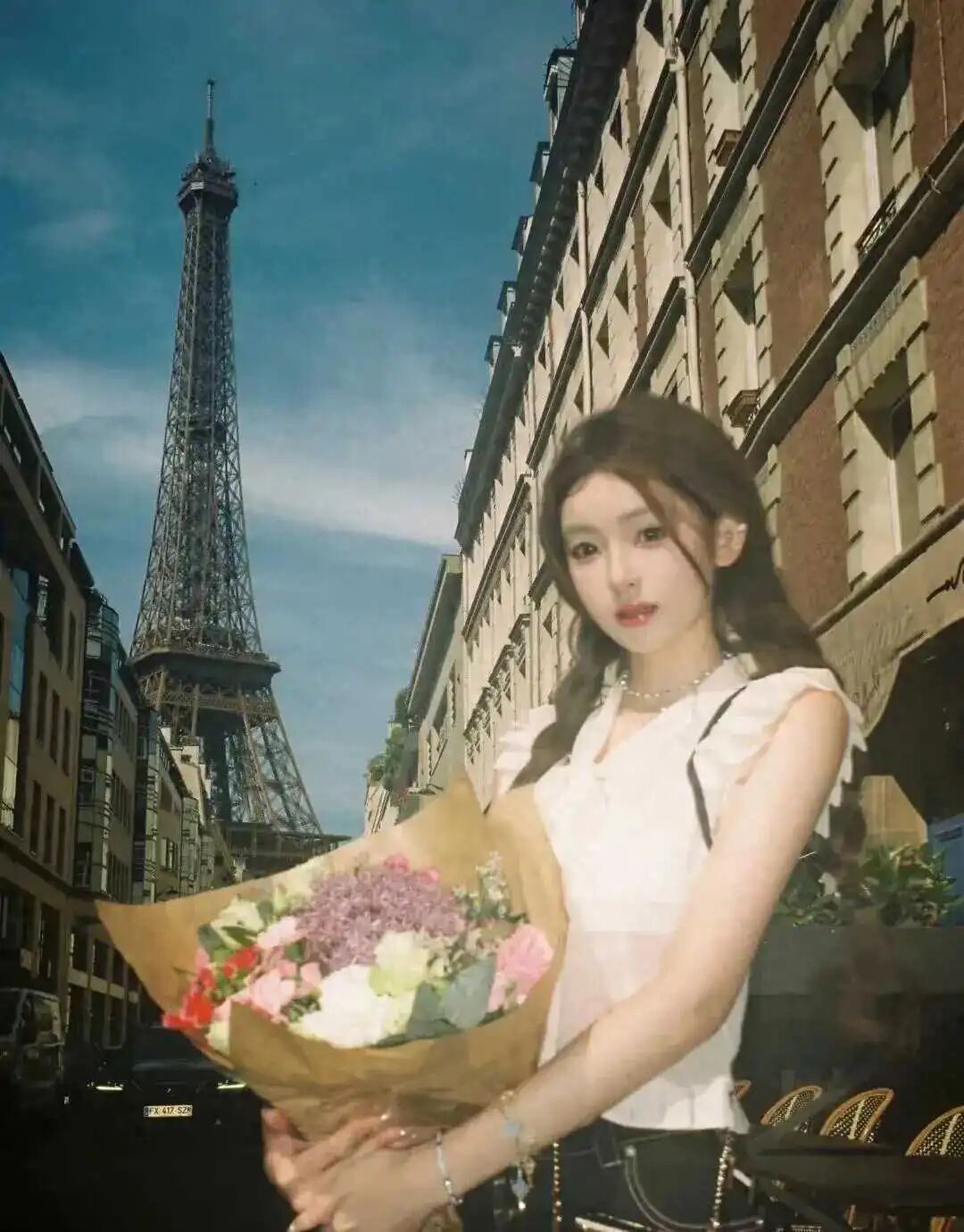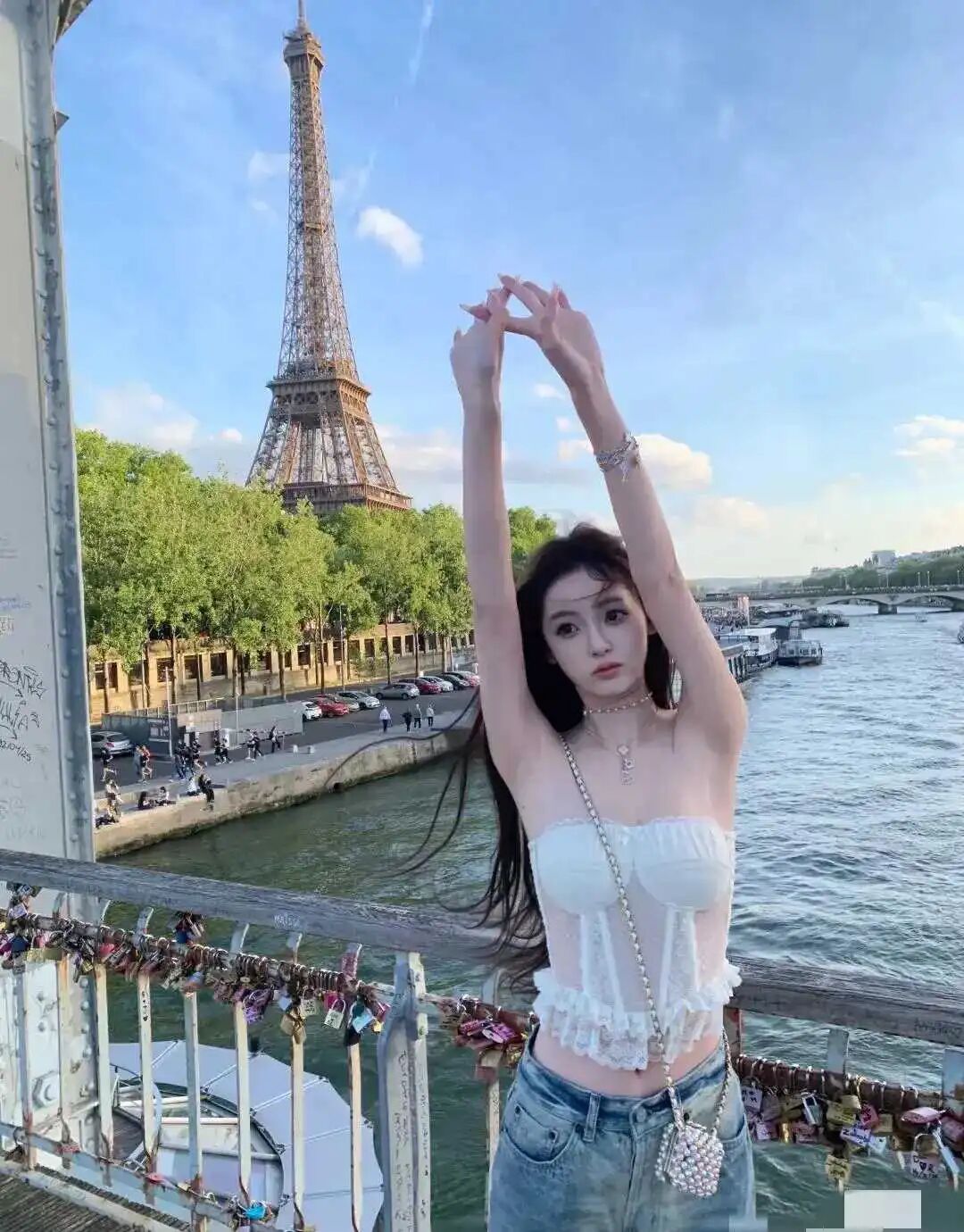 无论是在桥上远眺,还是在塔下仰望,亦或是在马路边随性漫步,每一个角度都被她巧妙利用,将巴黎铁塔与自身魅力完美融合。