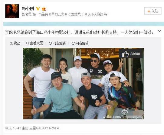 第三季“跑男团”齐聚海口,同冯小刚导演在电影公社合影,照片中冯导站在跑男团中面无表情,但在微博上豪气的放话:“谢谢兄弟们对社长的支持,一人欠你们一部戏。”但冯导的这条微博莫名就火了,不是因为电影,而是因为无意中曝光了BABY的素颜。