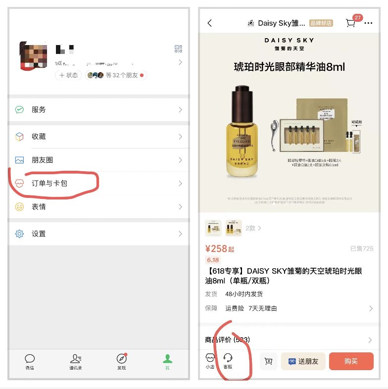 大家收到产品,如果有任何售后、使用方法问题,都可以在【微信➡️我➡️订单与卡包】位置,通过相应订单,进入产品页面,联系客服沟通咨询。