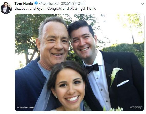 夫妻俩又惊又喜,自然不会放过和他合影的机会。事后,汉克斯还把他们的合影发到了推特上。