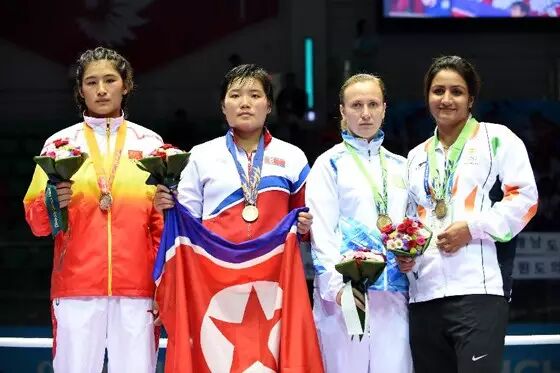 李倩(左一)获第十七届韩国仁川亚运会女子拳击比赛75公斤级银牌