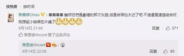 照片曝光后,火速就引来了众多小伙伴围观留言。让人意外的是,焦恩俊的女儿焦曼婷竟然也忍不住来评论了,而且一开口就醋意十足,吐槽两人虽然是剧里的郎才女貌,但合照也太近了。可能是担心被误会,最后又补充说这个组合很好,让她想起小时候在片场。