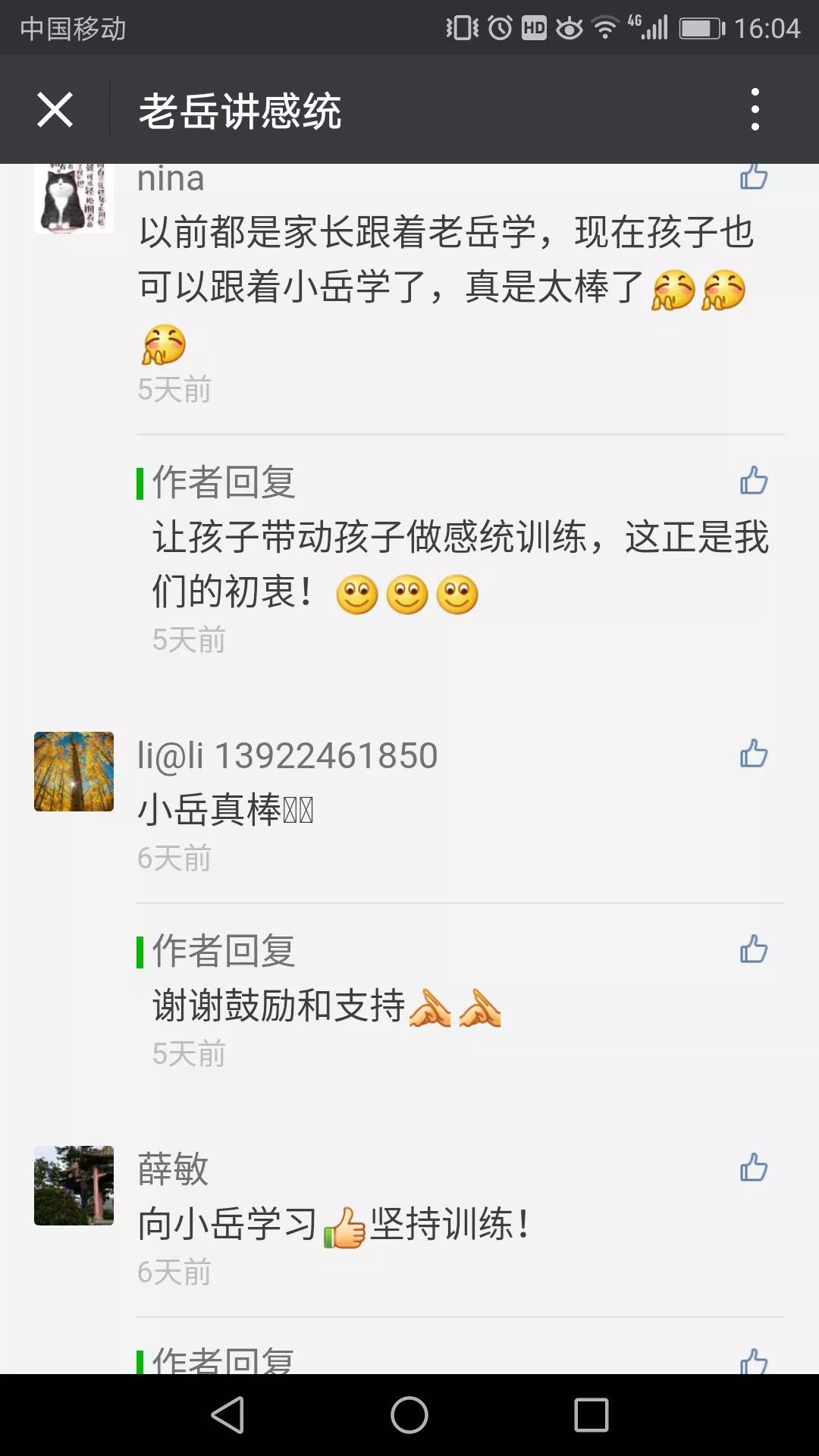 当我把大家的留言反馈一条一条念给孟瑶听时,她高兴得手舞足蹈,并向我保证,以后一定会更认真更努力地把感统游戏示范好,让小朋友们都喜欢她的课程,都愿意跟着她在家进行感统训练!希望通过老岳和小岳的共同努力,能帮助你的孩子,更加健康、快乐、阳光、自信的成长!