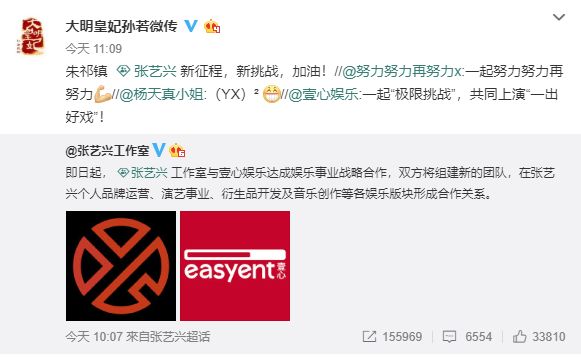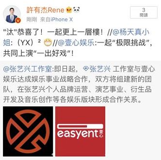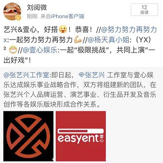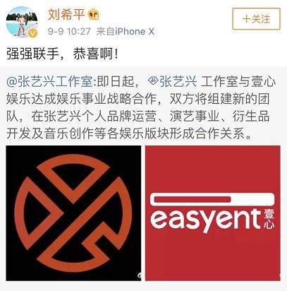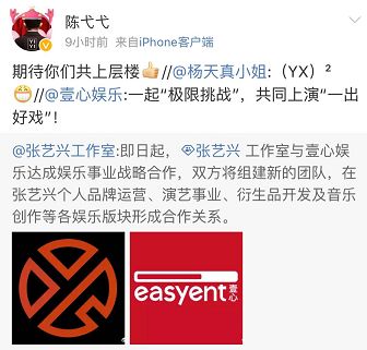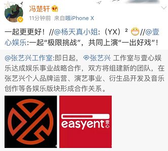 张艺兴工作室这一波解锁壹心娱乐合作,立刻得到了很多业内大佬的支持。