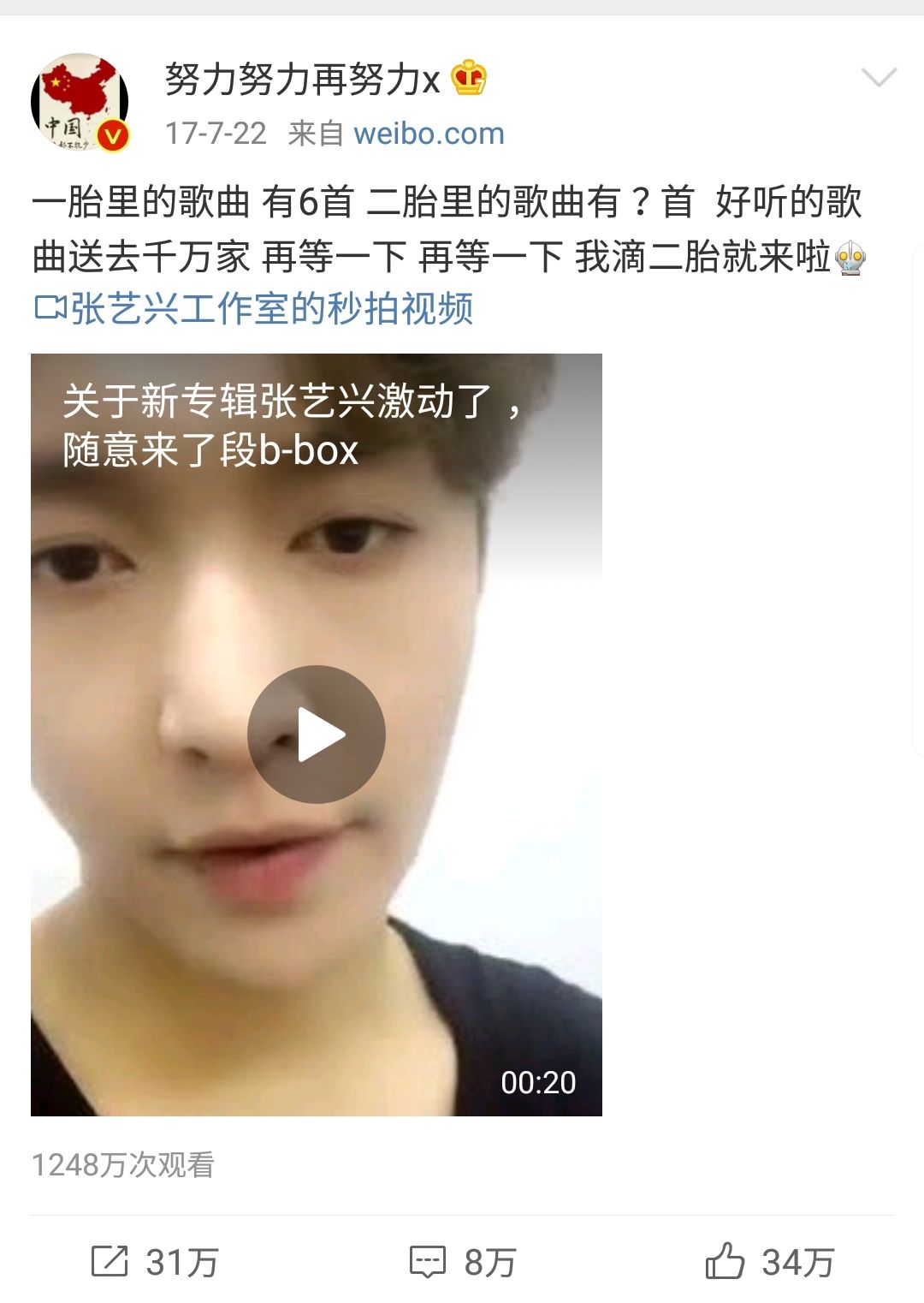 这位萌萌的大男孩,一直把自己的音乐专辑看做是自己的孩子,也才有了把专辑称作“一胎”“二胎”的说法。