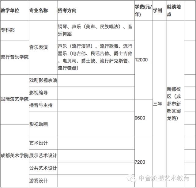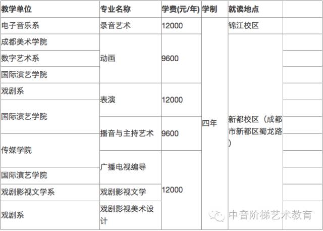 学校以教学为中心,积极发展各层次教育。目前学校本科层次有艺术学、管理学、工学三个学科门类,8个专业类、29个本科专业。学校于1986年取得音乐类文学硕士学位授予权,现已具有音乐与舞蹈学、美术学、艺术学理论三个一级学科硕士学位授予权;于2005年首批获得国务院学位委批准的艺术硕士(MFA.)专业学位授予权;于2014年获得教育硕士、公共管理硕士专业学位授予权。学校于2009年起和四川大学联合培养音乐传播学博士生,2013年成功获批四川省博士后创新实践基地。学校从2003年开始招生留学生及港澳台学生。
