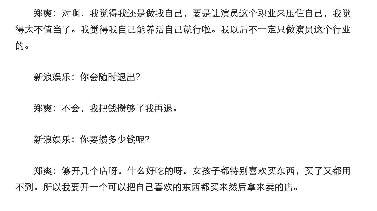 还有消息说郑爽是想攒够了钱就退圈,开几家店过更轻松快乐的日子。而早在四年前的采访中,她自己的话也证实了这一点。
