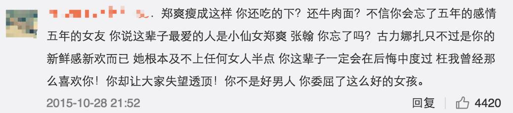 但当她和张翰越来越红、曝光率越来越高时却分手了。后者跟古力娜扎走在一起,被质疑为什么辜负郑爽的一片痴心,从此开始“吃碗牛肉面都被骂”的生涯。