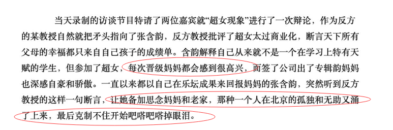 教授表示,天下所有父母的幸福都只来自孩子的成绩单。张含韵感到委屈,为自己解释说自己在学习方面真的没有很高的天赋,自己在歌唱事业上取得的成绩,妈妈一样开心。