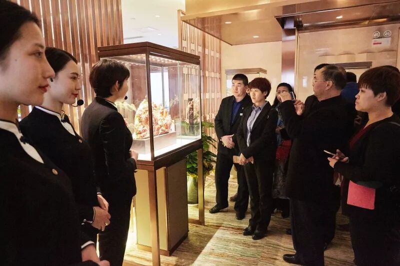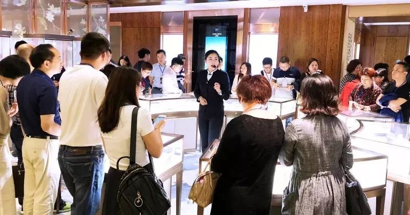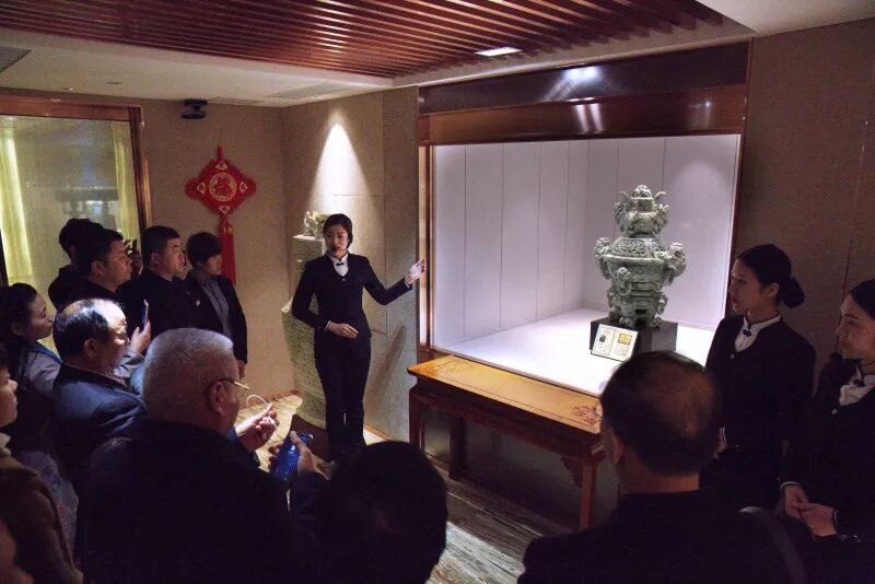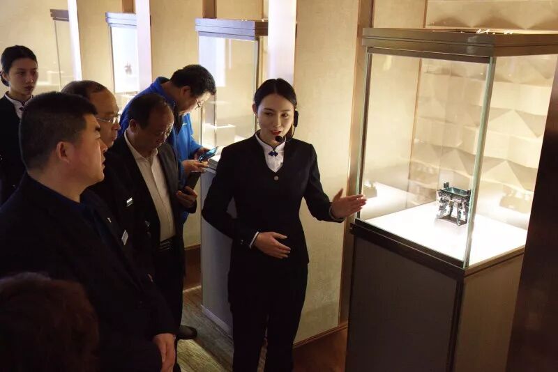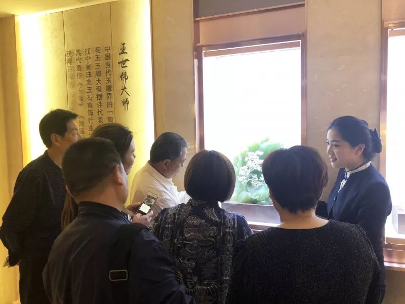 品牌文化讲解员为加盟商讲解董事长个人玉器摆件藏品