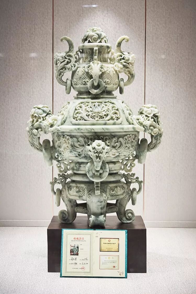 这件藏品是我们的镇馆之宝《翠玉花薰》,由我国首批享受国务院津贴的玉雕大师、国家级非物质文化遗产传承人王运岫大师,历经十年纯手工雕刻的一件非常杰出的艺术精品。众所周知,中国古代就有用香炉来熏香的先例,无事熏香,是中国人千年的风雅与禅意;传统的熏炉,是金属或者陶瓷所制的外表,在里面撒上香料,就可以散发出香味。而大家现在所看到的这件作品是由玉石雕刻而成,所选用的玉料为中国四大名玉之一的岫岩玉。作品分为盖纽,器身和底座三部分,周身用盛开的菊花作为装饰。菊花素有花中四君子的象征,古人云:“君子如玉,触手可温”。玉、菊花、熏在形、神、意上高度统一,完美融合。翠玉花熏的整体造型丰满圆润,纹饰大气美观,线条古朴流畅,做工繁复精美,在装饰和取材上都做到了里应外合、内呼外应。它集实用与美观与一体,展现出大师炉火纯青的工艺水平。王运岫大师传承古人“十年磨一剑”的工匠精神,十年琢一玉,为我们开启了这场精妙绝伦的艺术享受。