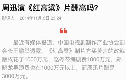 上一部《红高梁》,周迅就被质疑过,当时人们比较的焦点是,莫言就算拿了诺贝尔奖,身价也抵不上一个当红明星。