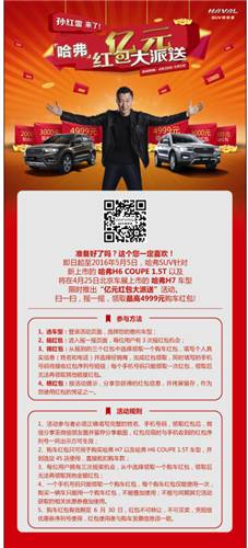 即日起至2016年5月5日,针对新上市的哈弗H6 COUPE 1.5T以及在4月25日北京车展上市的哈弗H7车型限时推出“亿元红包大派送”活动。扫一扫,摇一摇,领取最高4999元购车红包。