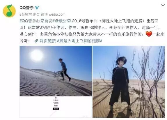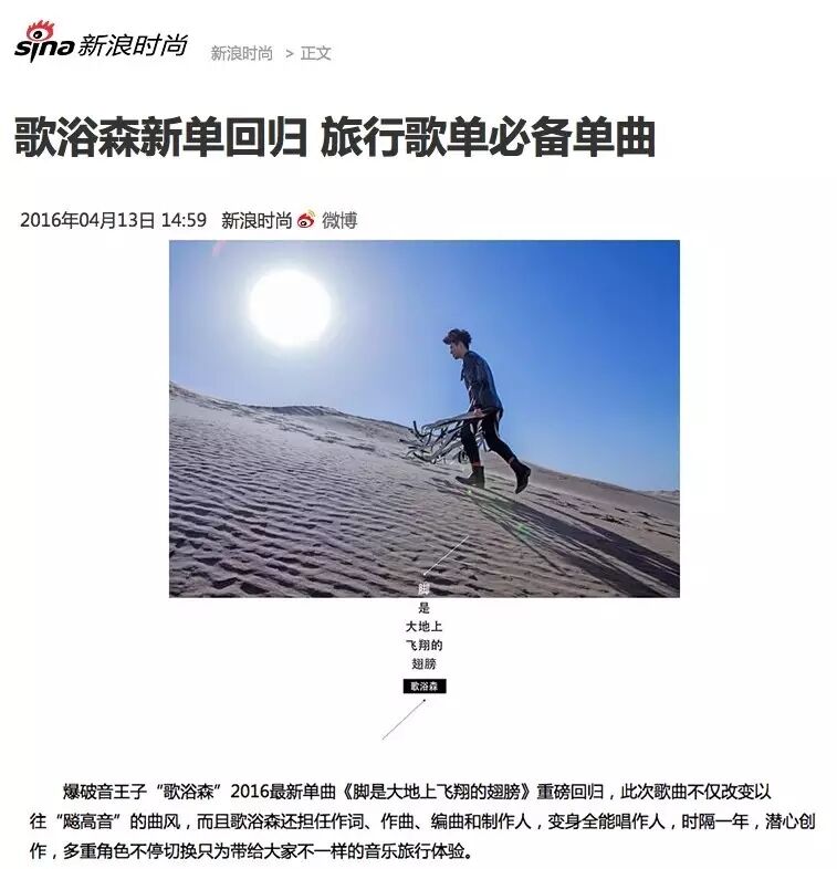歌浴森2016最新单曲《脚是大地上飞翔的翅膀》重磅回归,此次歌浴森担任作词、作曲、编曲和制作人,变身全能唱作人。时隔一年,潜心创作,多重角色不停切换只为给大家带来不一样的音乐旅行体验。