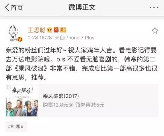 甚至连口味刁钻的校长王思聪,都在微博上推荐了《乘风破浪》,评价说“非常不错。”