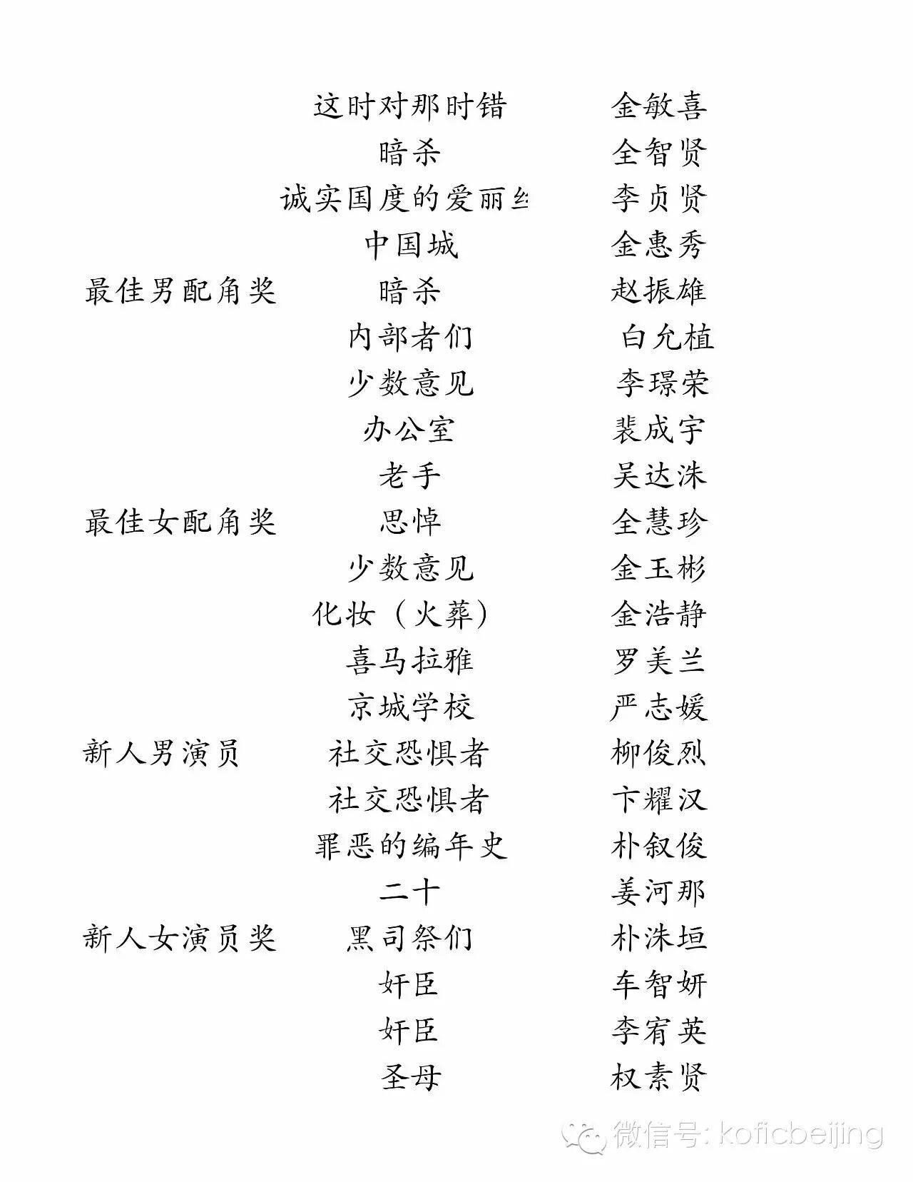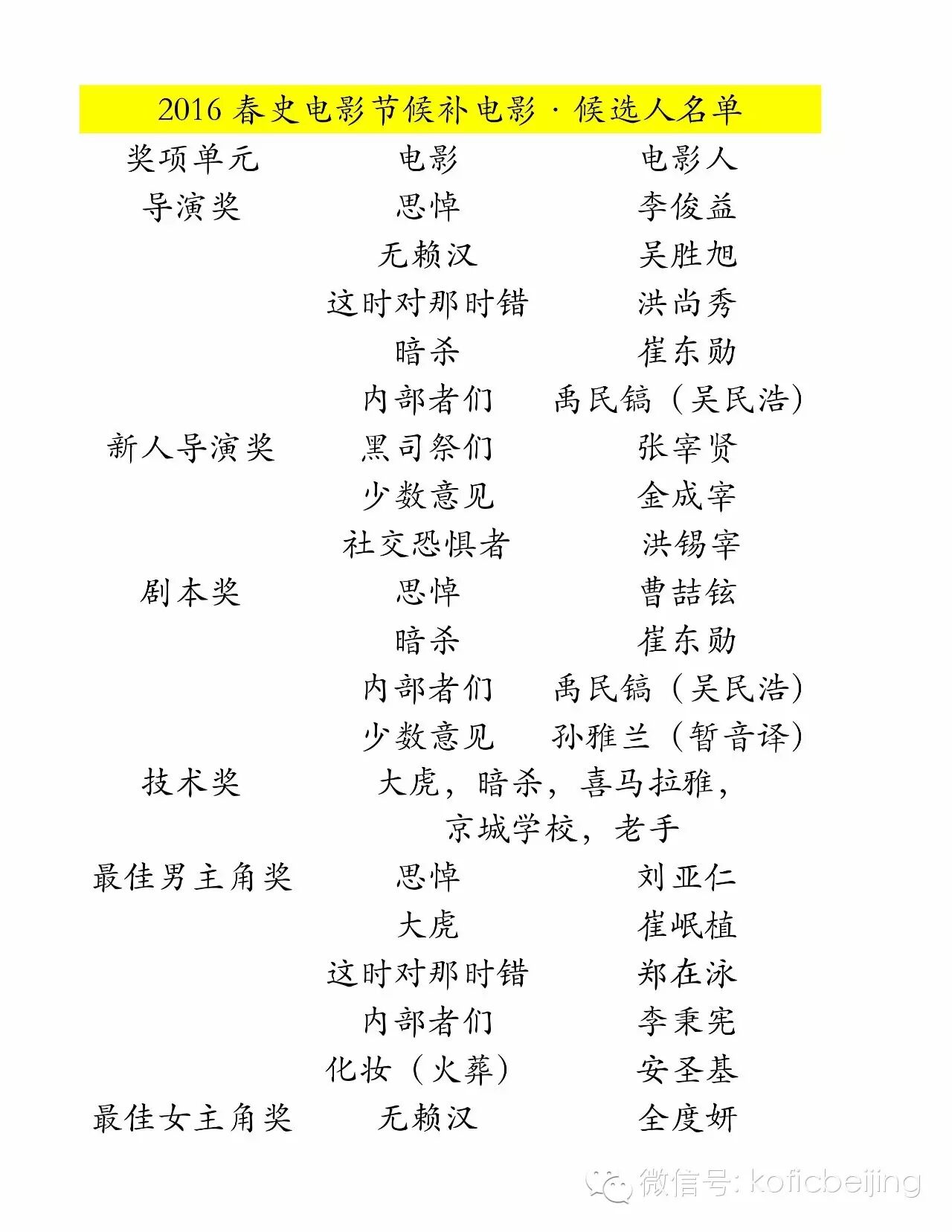 2016年春史电影奖候补作品·候选人名单如下: