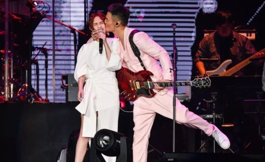 两人合唱时,李荣浩唱到激动处突然霸气的抱住杨丞琳亲吻。
