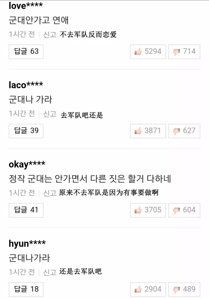 可是,在恋情曝光的喜讯之下,韩网的评论竟然是这个画风,全都是都是围绕徐仁国的入伍风波...哎...