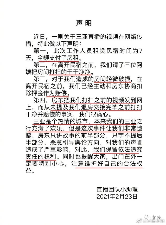 也就是明星团队去三亚民宿租房卖货,结果把人家房子给搞的太脏太乱并且破坏了部分,导致了房东的不满。