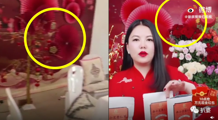 吃瓜群众发现民宿房东晒出来的视频图里的背景和李湘带货直播中的背景版一毛一样。