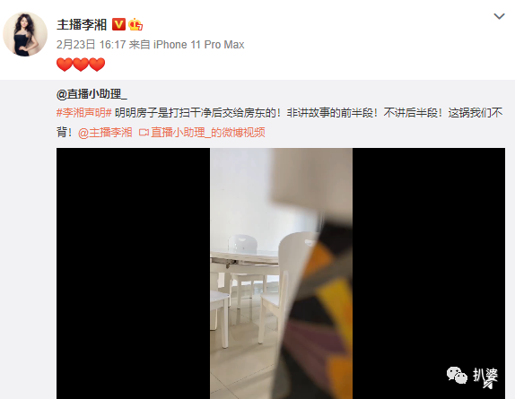 接着李湘又转发了一条直播助理发的“打扫后干净的房子”视频,给自己洗冤。