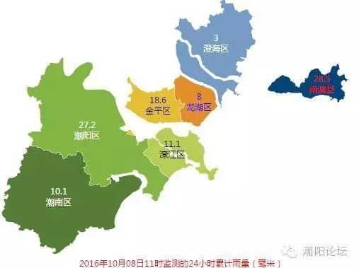 而据汕头气象网消息,因受今年19号台风“艾利”的外环流影响,截止今天(10月8日)上午11时,潮阳的降水量达27.2毫米,仅次于南澳县的28.5毫米。这也就能说明早上的道路为何被淹了...
