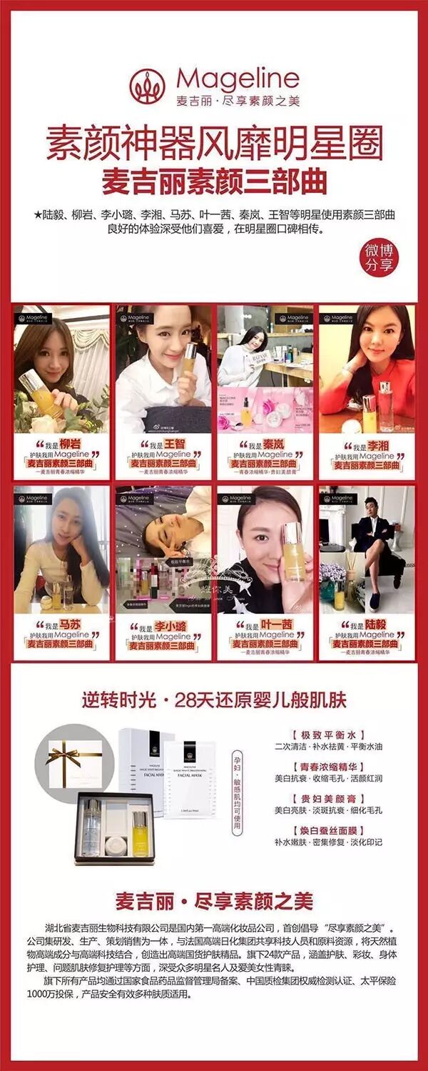 大家更加有所不知的,就是众多一线明星名媛也是独宠麦吉丽高端护肤产品的,贵妇胎盘神仙膏早已经是众多演员明星的必备之素颜神器!