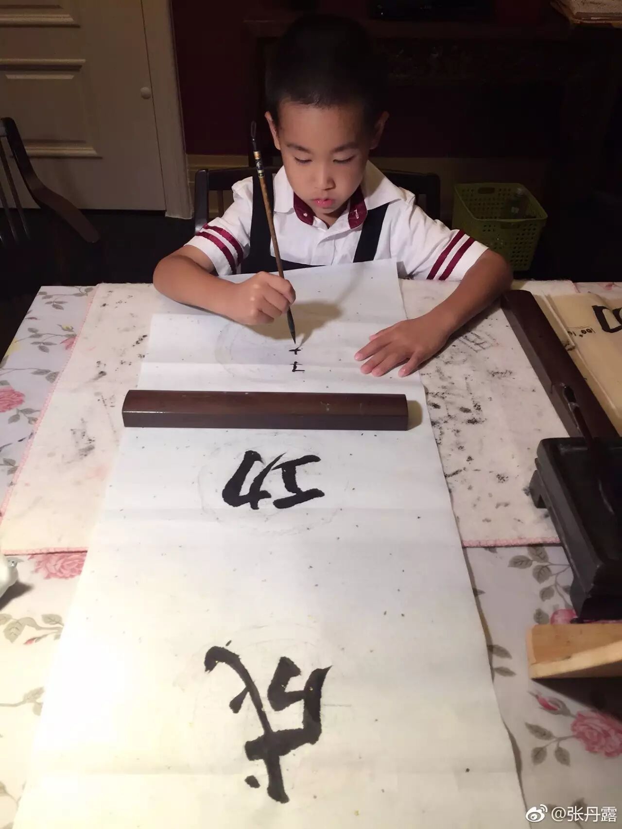 张丹露也经常在网上和网友分享他们生活的点滴,近日她就在社交网上传多张女儿和儿子练书法和画画的相片,并留言表示:“周(周)一:姐姐的工笔划(秋葵)、抄心经和弟弟的书法课,都写的越来越好了。”