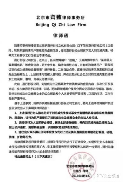 关于杨幂和刘恺威的离婚消息基本上已经成为了月经新闻,终于,今天嘉行影视公司发了律师函!把这件事做个了结!