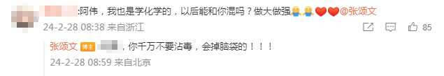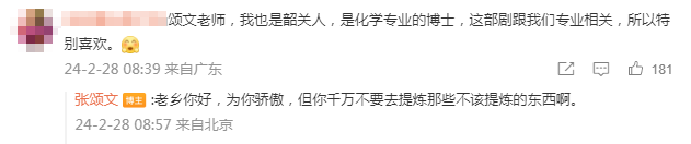 有网友给张颂文留言:“颂文老师,我也是韶关人,是化学专业的博士,这部剧跟我们专业相关,所以特别喜欢。”张颂文劝他:“老乡你好,为你骄傲,但你千万不要去提炼那些不该提炼的东西啊。”
