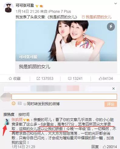 而张凯丽也曾在女儿的微博评论称,女儿6岁登台,高考577分,艺考四所顶尖大学录取,这样的女儿足以让我们骄傲!