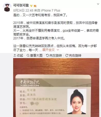 张凯丽的女儿叫张可盈,长得漂亮还是个学霸,今年20岁,现在是中戏的学生,她在微博自曝: