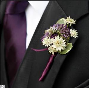 这一类新郎胸花,从西服颜色中“摆脱”出来,转而配合新娘的捧花,要么是与新娘捧花同一种花材,要么是与新娘捧花同一色系。这是最无私忘我的搭配方法。