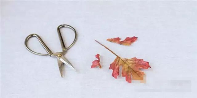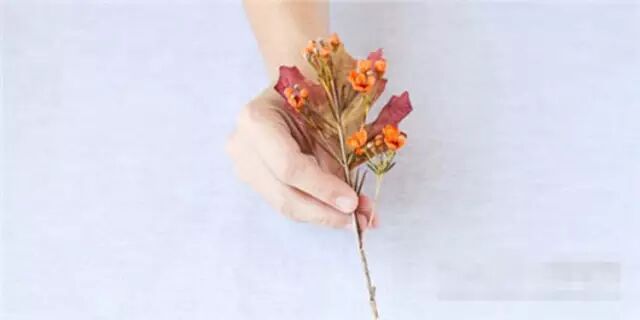 橙色喷雾玫瑰,橙色蜡花、秋天的树叶、橙色小花、线或者绳、剪刀。