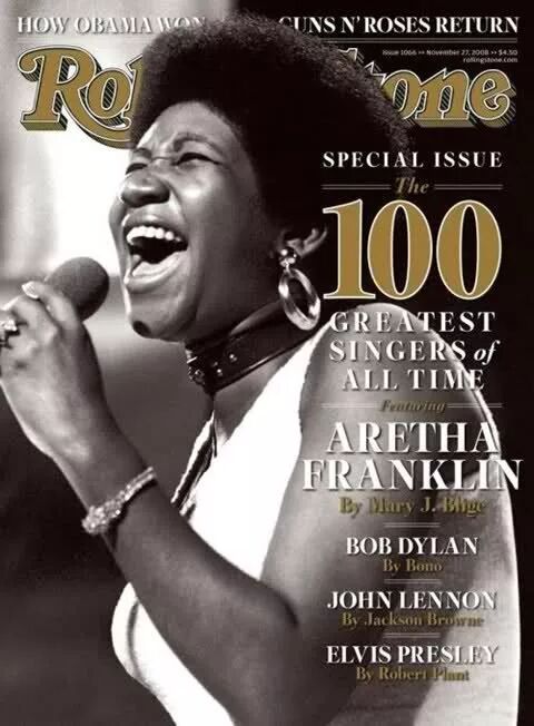 音乐杂志《滚石》(Rolling Stone)在2008年评选出了“史上最伟大的百名歌手”,一时所有人都在关注“第一”会花落谁家。猫王Elvis Presley,排在了第三名;人们最为熟知的披头士乐队主唱John Lennon排在了第五,歌王Ray Charles排在第二。他们都没敌过一个黑皮肤的胖女人,这个女人便是Aretha Franklin,她当之无愧。