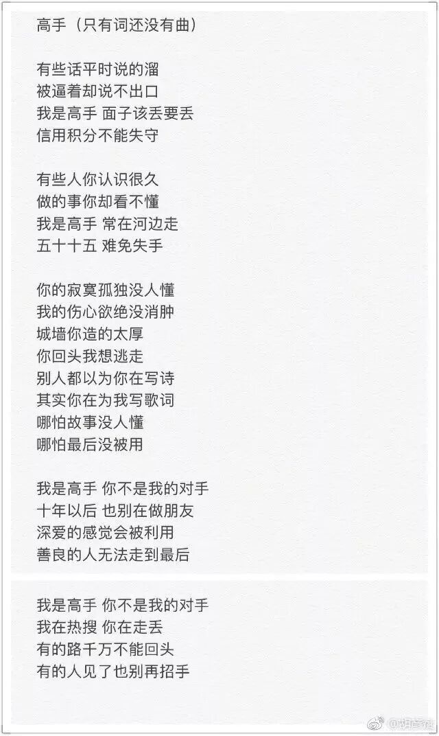 还配了一首还没谱曲的词:“我是高手,你不是我对手。我在热搜,你在走丢。有的路千万不能回头,有的人见了也别再招手。”