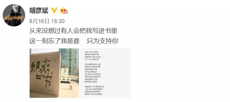 后来,胡彦斌发了微博:“从来没有想过有人会把我写进书里,这一刻忘了我是谁,只为支持你。”