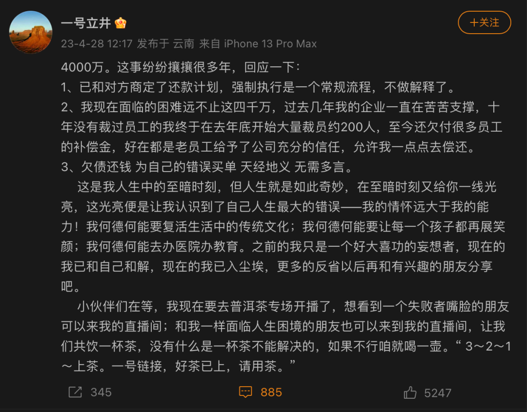 “4000万,这事纷纷攘攘很多年”,4月28日,李亚鹏在微博回应被强制执行4000万的消息。