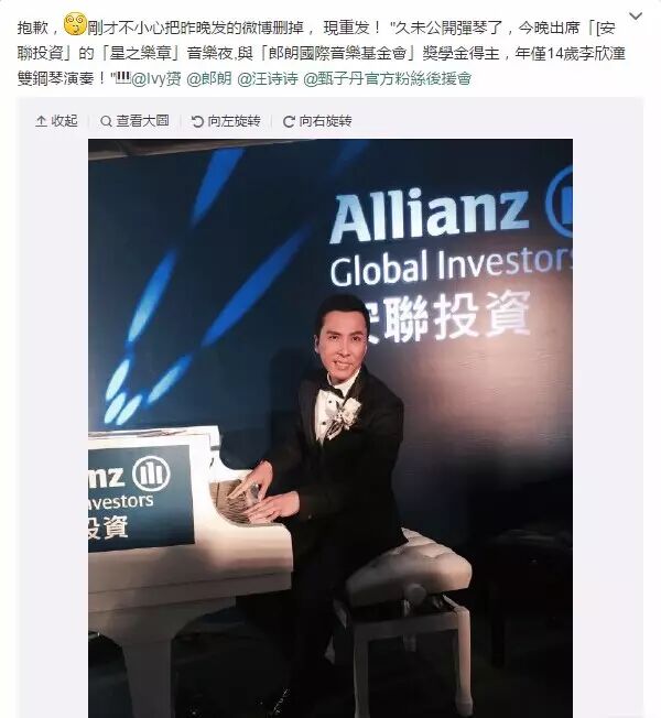 丹爷自己说,他平时在有情调的时候会弹钢琴,看来他生活处处是情调啊!就连在外地拍《叶问》的几个月期间,还特地在酒店租了一架钢琴!