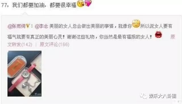 张雨绮是李念的圈中好友,李念对待闺蜜出手相当阔绰,随便送一个礼物都是刷爆整个娱乐圈。毕竟,像名车名表名首饰,李念的眼中都不算什么,只要朋友高兴,她倒是也不吝啬。