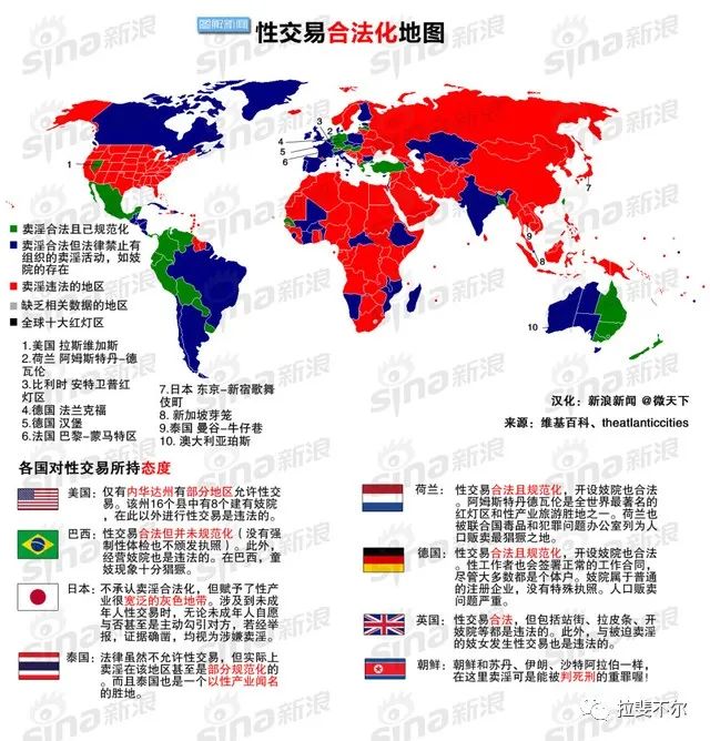 美国一家研究机构对100个主要国家的性交易作了研究,11个国家规定,性交易有限制的合法;只有39个国家性交易不合法,这包括了阿富汗、阿尔巴尼亚、中国、伊朗、伊拉克、古巴、韩国、朝鲜、乌干达……