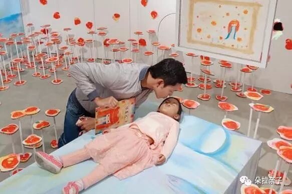 父女俩一起去看展览,小姑娘心血来潮躺在床上,等待爸爸来吻醒自己。立威廉自然不会让女儿失望,给予爱意满满的亲吻,吻醒自己的小公主。
