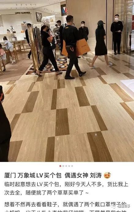 7月29日晚,有网友在社交平台晒出偶遇“女神”刘涛现身厦门逛LV购物的动态。该网友发文称刘涛、 秦岚、杨幂是自己心目中的三大女神,所以对于今日份偶遇刘涛她本人也是相当兴奋,配文写道:此处省略一万字,我激动的心啊~