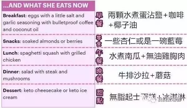 从2009年起,她严格自己的控制饮食,戒掉了所有垃圾食品,首先她改变了过去的饮食习惯,选择低脂食物,并且采用少食多餐的方式让自己保持八分饱的状态。