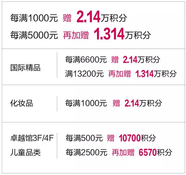 注:卓展超市、卓展本馆2F珠宝品类、辅业及特例品牌除外,不包含身份积分及消费积分,具体规则详见店内明示。