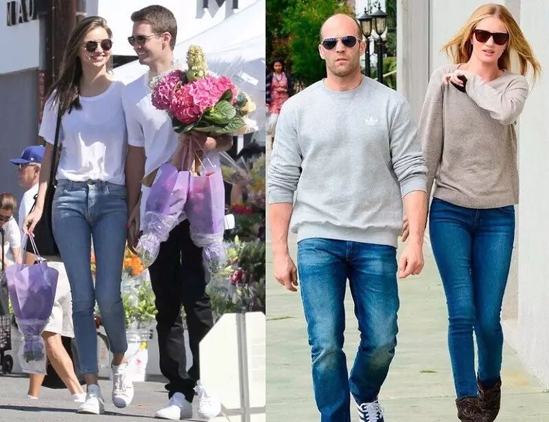 超模Miranda Kerr和未婚夫Evan Spiegel都选择以白Tee搭配牛仔裤和白色运动鞋,而刚刚宣布怀孕的超模Rosie Huntington-Whiteley与男友Jason Statham则以同色的牛仔裤分别搭配灰色卫衣与米色的针织罩衫,看上去不仅生活化,清爽又登对。