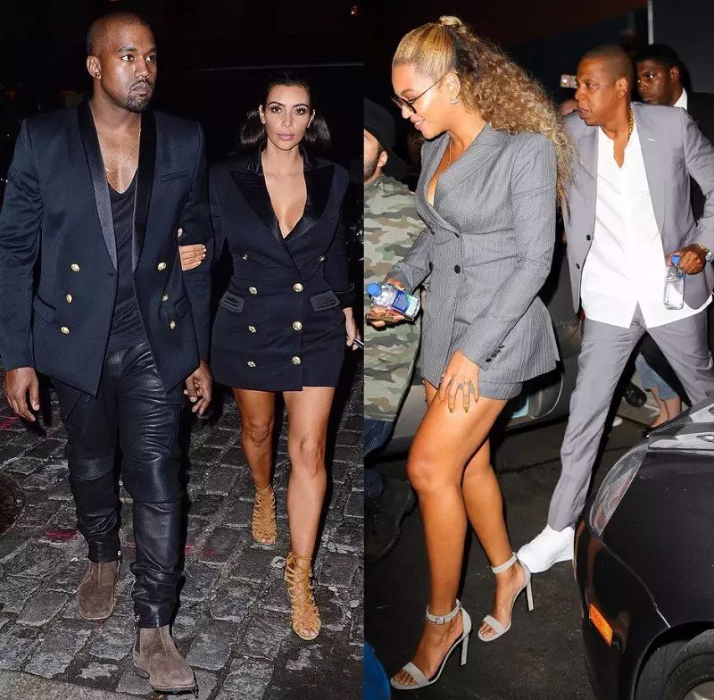 Kanye West与Kim Kardashian夫妇穿着同品牌的双排扣西服出街,而Jay-Z与Beyonce也选择了同色系的西装外套。